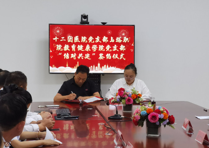 为深入推进医院与学院党建联建机制,形成党建工作共创共赢新格局,以党建引领,推动医院和学院高质量发展,5月11日下午,第一师十二团医院党支部与阿拉尔市塔里木职业技术学院教育健康学院党支部 “结对共建”党建联建签约仪式在十二团医院举行。塔里木职业技术学院教育健康学院党支部书记张萌萌等,医院党支部副书记、院长安卫民等相关职能部门负责人参加签约仪式。签约仪式由安卫民主持。