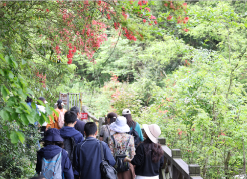 赏风景,强体魄。期间,老师们穿越桀骜不驯的金蟾飞瀑,徒步凌空飞渡的栈桥,辨认着各种奇特的花卉植物,在清澈见底的溪流中寻觅鱼的踪迹,欣赏着红颜落泪等无数的美景,惊叹着树坚强--宜昌楠的魅力,品鉴着峡谷中“独行穿落叶、闲坐数流萤”等优美诗句。老师们身临其境,心悦诚服,快乐无限,收获满满。