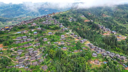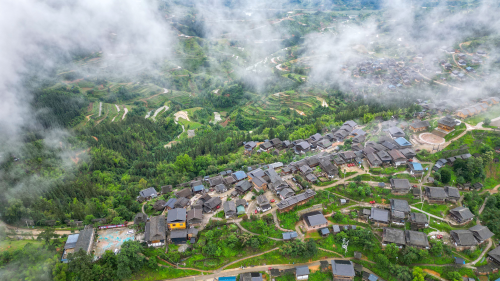 初夏时节,贵州省黔东南苗族侗族自治州从江县丙妹镇大歹云雾飘渺,错落有致的吊脚楼与苍翠青山交相辉映,宛如一幅秀丽的乡村生态画卷。