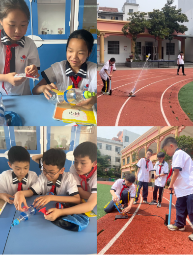 首先,少先队员们用两个500毫升的可乐瓶剪成水火箭的尾部;然后,用塑料板制作水火箭的机翼和尾翼;接着,用方形布块和短绳做成降落伞,用国旗贴画装饰瓶体;最后,把特制的喷嘴装到水火箭的底部……大约二十分钟,在队员们的合作中,一个个独具创意的“水火箭”诞生了,伴随着一个个水火箭升上天空,队员们不约而同地欢呼鼓掌,科学梦科技强国梦也在心中生根发芽。