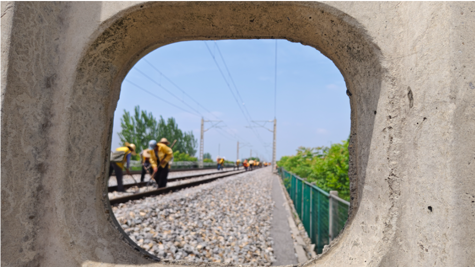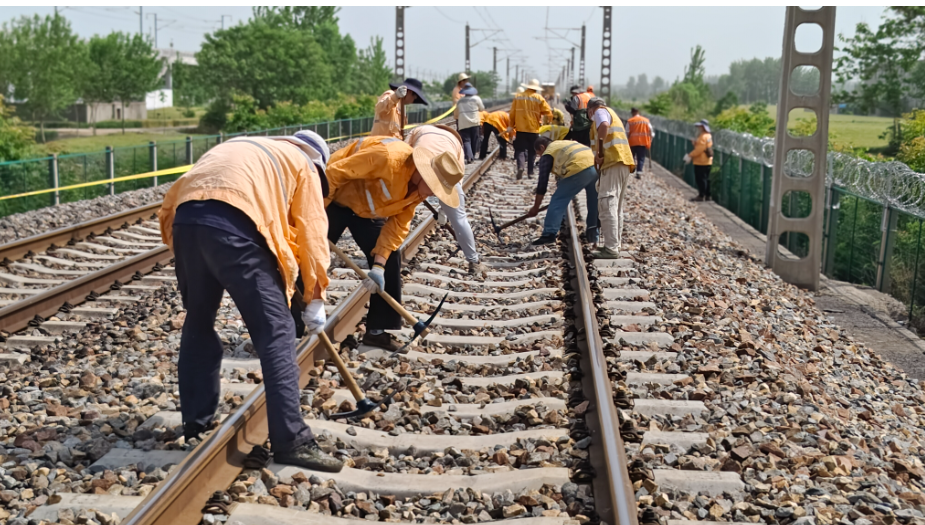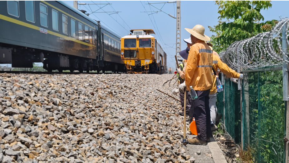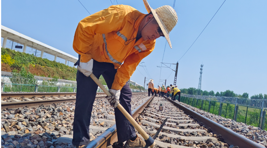今年23岁的朱航宇来自淮西车间,自集中修开始以来,他一直都是跟机回填道床。1米八多的身高,使用半米多长的三齿耙,他在扒砟时腰弯的总是要更深一些,同样的也要更累一些。队员宁明昌家在河南周口,“五一”期间在单位应急值守,“五一”后集中修开始,他就每日配合施工,连续20多天没有休息。在一个个骄阳似火的中午,一群朝气磅礴的年轻小伙战高温斗酷暑,无畏烈日,不惧“烤验”,在集中修的“阵地上”鏖战“沙场”,奋勇拼战。30名平均年龄25的队员浑身散发的青春活力,他们汗水浸透的衣背、斗志昂扬的精神成为铁路上一道靓丽的风景线。(安徽亳州火车站线路车间:张林伟)