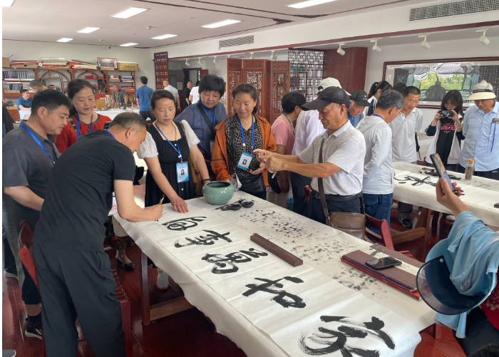 老年开放大学一行首先参观了学校图书馆、教师阅览室,随后在书画室进行书法创作,现场挥毫泼墨,互评墨宝,气氛热烈。最后大家来到报告厅一楼,参观以“弘扬工匠精神 书绘职教美篇”为主题的书画展,并合影留念。活动在轻松愉快的氛围中进行,学员们兴致勃勃地观展,纷纷表示不虚此行。