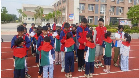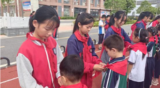 “欢迎新队员光荣地加入了少先队组织……阳光下的队旗、红领巾显得格外鲜艳!”少先队辅导员潘程程老师给同学们送去了殷殷祝福,希望同学们践行誓言,让革命薪火代代相传。