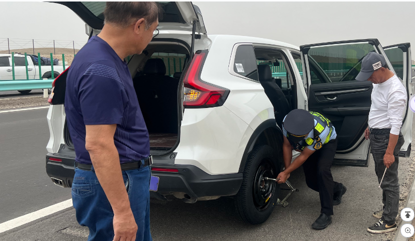 近日,新疆交通运输综合行政执法局阿克苏执法支队温宿执法大队在执行高速公路巡查执法任务时,巡查至G3012线K400+000米处时发现一辆新A·W8S38号小型轿车停靠在应急车道。经询问得知车主是从广西来新疆旅游的,途经此处时左后轮突然爆胎,导致车辆无法继续行驶。虽然有备胎,但却并不知道该如何操作,只得在应急车道等待救援。