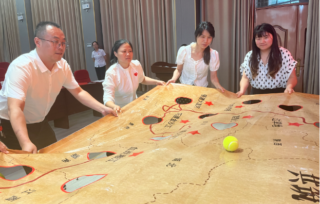 活动现场热闹非凡,党员教师80余人参与活动。竞赛项目设计独特,融合了红色元素与趣味性,既有紧张刺激的竞技比赛,也不乏轻松愉快的团体项目。比赛分为“红歌猜猜猜”、“重走长征路”、“廉洁之风大家吹”、“听党话,跟党走”和“红歌献给党”等几个环节,特别是“重走长征路”,将本次运动会的气氛推向高潮,团队成员相互合作,通过调整长征路线图的高低倾斜幅度,推动网球沿着红军长征路线前进,最终掉落指定地点。这一创新设计不仅考验了参赛者的反应速度和运动技巧,更增添了比赛的趣味性。