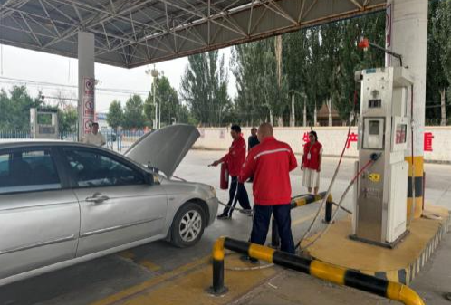 演练模拟场景为一辆准备加气车辆的车盖突然起火,火势迅速蔓延,情况危急。加气站第一时间发现火情并迅速启动应急预案,紧急通知相关部门。