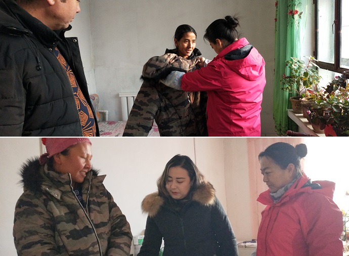 难群众和自己的结亲户送去了冬日的温暖,为结亲户穿上带着爱心的棉服,让他们感受丝丝的温暖。