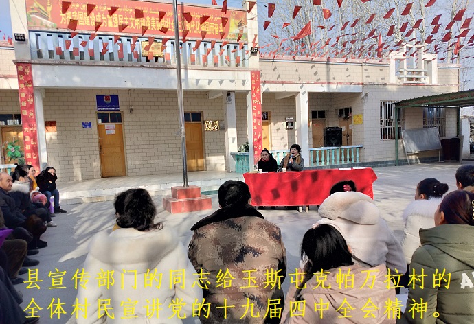 为更好地学习贯彻党的十九届四中全会精神,结合“不忘初心、牢记使命”主题教育活动,2020年1月8日中午,来自县宣传部门的同志给玉斯屯克帕万拉村的全体村民宣讲党的十九届四中全会精神。