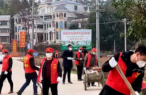 清风网邵阳讯(通讯员 刘志坚 黄能果 石颂军)2月1日上午,新邵县陈家坊镇洪庙村党员干部自发组成疫情防控志愿服务队,忙碌在村内组织开展环境卫生清扫、消毒疫情防控宣传等工作,合力打好疫情防控阻击战。
