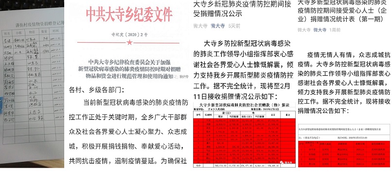 严把公示公告关。通过公示栏、微信群、微信公众号等途径,及时发布公示《大寺乡新型冠状肺炎疫情防控期间接受社会各界捐赠物资统计表》,并将相关收据通过微信及时反馈给捐赠者,自觉接受社会监督,让捐赠者放心。