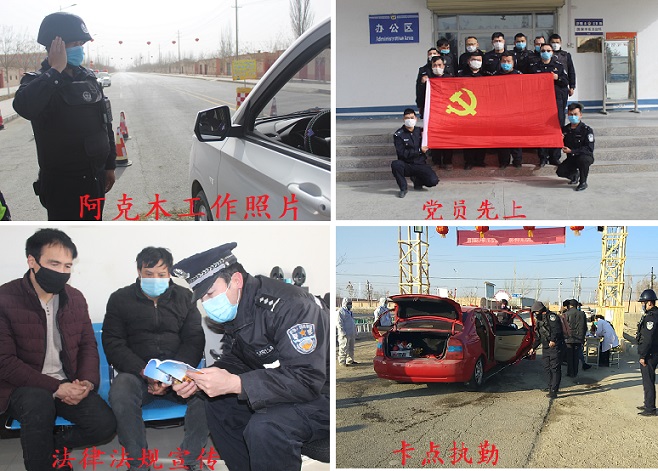 “同志,请您停车进行检查,请配合登记”,在新型冠状病毒全国蔓延的严峻时刻,海楼派出所县聘干部阿克木·穆萨又是海楼镇大十字执勤点负责人,又是海楼镇2号安全监测卡点执勤民警。疫情防控期间,他的执勤的是进入海楼镇的交通要道。为此,疫情防控期间,阿克木·穆萨毅然投身于疫情防控一线,尽职尽责做好过往人员车辆排查、体温检测、消毒工作,同时对过往人员进行疫情防范知识宣传。患有高血压的他始终坚守在一线卡点,有时一站就是一天,经常头晕眼花到连站都站不稳。所长要求他一定要照顾好自己,否则就将他调整至其他岗位。刚毅的他瞪着眼睛向所长保证:“扛得住!”一同工作的医护人员也常劝他要多休息,但他却说“身为一名党员,在党和人民需要我的时候我怎么能退缩?”家就在海楼镇的阿克木·穆萨对公安工作有着特殊的情怀。小时候,家里有四个孩子的他们经常吃不饱饭,在党和政府的帮助下,姐弟四人不但都读书工作,阿克木·穆萨还得以参军入伍。退伍回来后的他,一心想回报党和政府。时值公安招聘警员,阿克木·穆萨毫不犹豫地报名,后又顺利成为沙雅公安的一员,这一干,就是十几年。原本就能吃苦能奉献的他,在疫情阻击战中,更是坚定地让自己化身为一堵坚不可摧的疫情防护墙,坚决阻断病毒疫情,把自己对党和政府的感恩书写在对工作的敬业中。