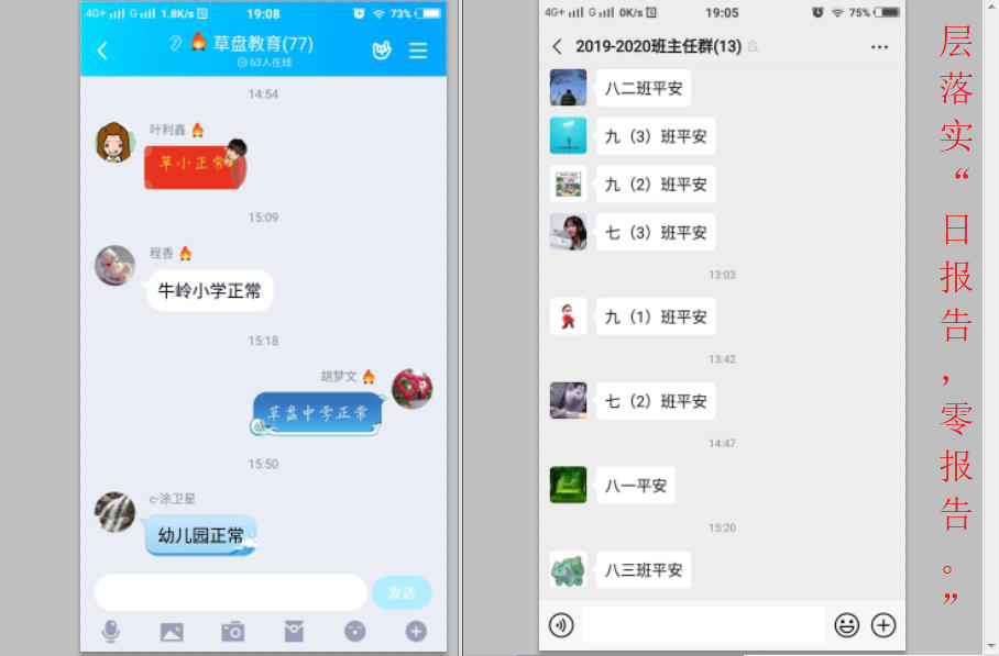 2、对全镇教职工(含退休人员和临聘人员)及学生是否属于“四类人群”进行地毯式排查,与相关人员密切联系,实时跟进,直至脱离隔离期为止。中心学校和各校还下沉到各联系村,协助各村排查“四类人员”,各学校教职工积极参与到镇、村路口卡点的值班值守,并积极开展形式多样的疫情防控宣传。