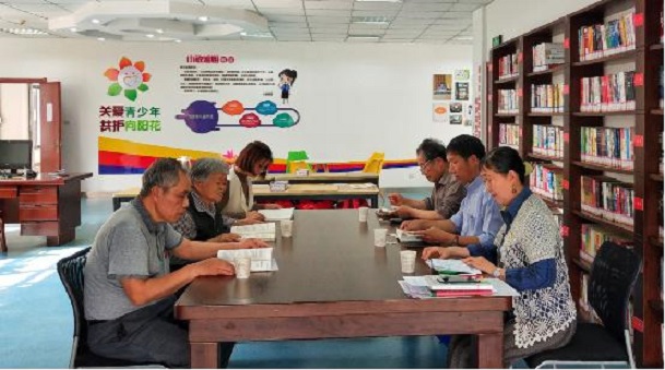 图为:梅荆三社区党总支党小组“读廉颂廉”读书会的场景
