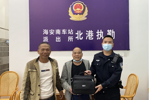 民警通过失主所描述的出租车特征及离港时间,经调取监控,马上就找到了失主所描述的出租车,经民警电话联系出租车司机,司机称车上确实有旅客遗忘的黑色公文包,其发现后排有乘客落下的行李后,在徐闻港一直寻找失主,但又联系不上。不久后,出租车司机将乘客的黑色公文包送回北港码头,并将公文包交给失主刘先生。经刘先生现场清点,包内的证件、现金均齐全,刘先生紧紧地握着民警的手,不停的道谢。
