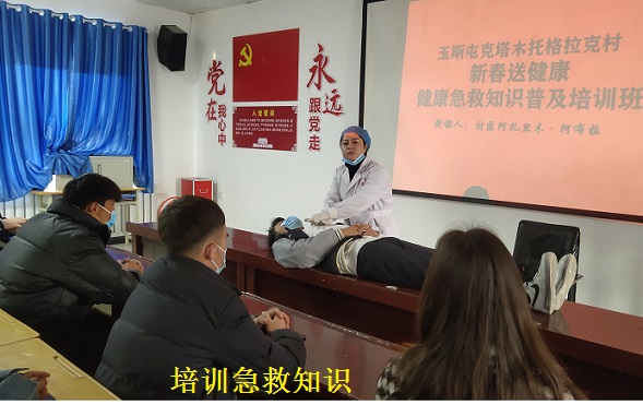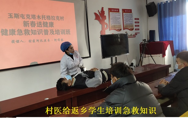 为让村民度过一个欢乐、健康的新年,进一步提高群众对健康急救知识的普及的防治意识,阿克苏检察分院驻阿瓦提县塔木托格拉克镇玉斯屯克塔木托格拉克村工作队结合本村目前老人和孩子较多的实际,特邀村医阿扎旦木·阿布拉,为返乡的大中专学生带来了一堂以“新春送健康”为主题的健康急救知识培训,通过培训让大中专学生掌握急救知识,再挨家挨户进行急救知识宣传,提升全村的健康急救能力水平。