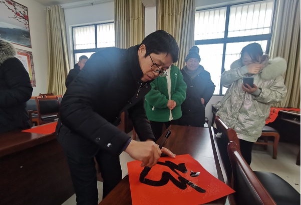襄阳黄龙:墨香温暖群众心 2022年01月27日 来源 : 清风网 作者: 周满荣 一审:周满荣 二审:宁基 三审:周秋连 1月26日,革命老区襄阳黄龙镇方岗村会议室外大雪纷飞,室内墨香四溢。该镇书法爱好者们正在挥毫泼墨为方岗村群众义写春联。 时值春节来临,为弘扬民族传统文化,营造浓厚的文化年味,该镇文化站、书法协会联合组织书法爱好者组成新时代文明志愿服务小分队冒着大雪专程赶到湖北省美丽乡村建设示范村—方岗村,为该村困难群众和困难党员义写春联。当天,书法爱好者们为群众义写春联300多副,“福”字400多个,受到该村干部群众称赞。(黄龙镇人民政府:杨涛 )