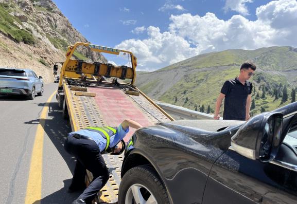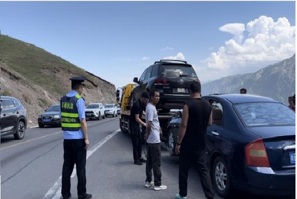 就在执法人员刚将这辆故障车辆护送下山期间,又有一辆旅游车辆开启双闪停于路面,执法人员立即指挥双向行驶车辆交错行驶,一起陪同车主等待救援,在等待期间,车辆发动机温度恢复正常,随即安全驶离,真是有惊无险!执法人员下山巡查至K57+200米处,又有一辆蓝色小轿车发生故障停驶,执法人员与车主共同将车辆推至应急停车带,将车辆固定在此前的救援拖车上,一并拖离现场。察布查尔执法大队执法人员无畏酷暑,不惧“烤”验,接二连三的救援车辆,疏导交通,保障公路安全畅通,赢得了过往司乘人员的一致好评。