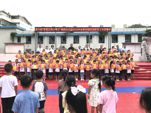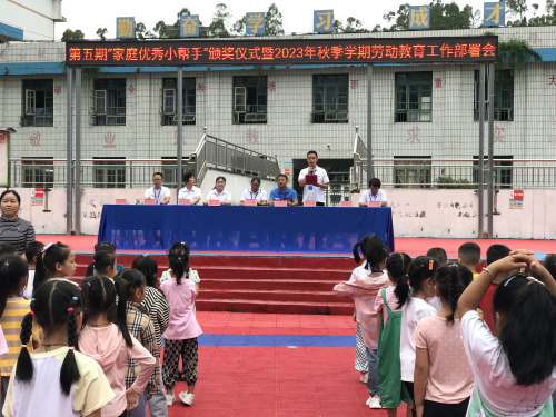 9月13日,丙妹镇中心小学全体师生集聚操场举行第五期“家庭优秀小帮手”颁奖仪式暨2023年秋季学期劳动教育工作部署会。仪式由大队辅导员吴丽丽主持,邀请到学校关工委五老参加了此次活动。学校从暑假伊始就部署以培养学生居家养成良好的劳动习惯作为重点,学生每天将自己在家务劳动过程中的照片、视频上传到班级微信平台,各班采取自评和互评相结合的办法,评选出合格的班级“劳动之星”,再推选出校级“家庭优秀小帮手”,最后学校综合评审推荐出152名“家庭优秀小帮手”进行予以鼓励和表扬。会上,德育副校长廖锦彪对2023年春季学期劳动教育工作的开展和取得的成果给予充分肯定,并对新学期的工作提出新的目标。