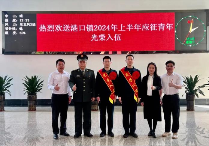铁骨铮铮好儿郎, 热血青春献国防。3月12日下午,阳光明媚,春风拂面,广东省中山市港口镇新港社区举行了一场简单而庄重的欢送仪式,为即将踏上军旅征程的尹升骄、周瑞鸿两位新兵送行。